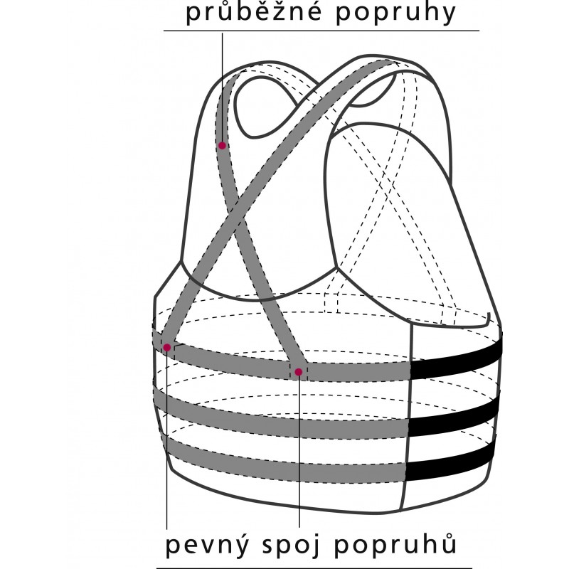 - Tvarovaná pěna a trojité boční stahování dvěma popruhy a gumou zajišťuje vestu pevně na těle jezdce, aniž by omezovala pohyb.