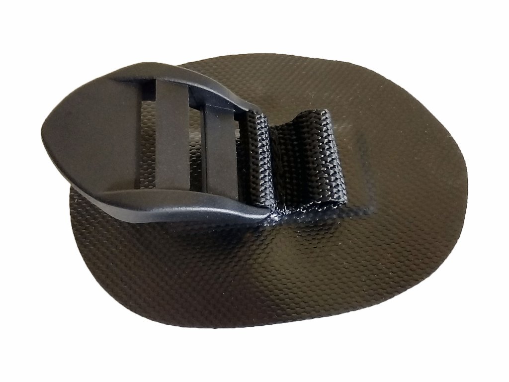 Plastová průvlečná spona s textilním očkem pro uchycení horního popruhu zádové opěrky packraftů.
