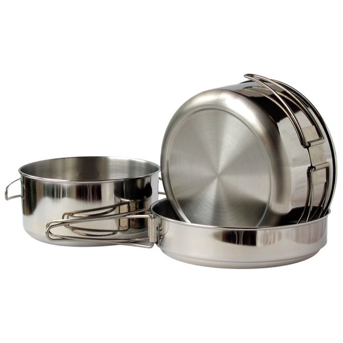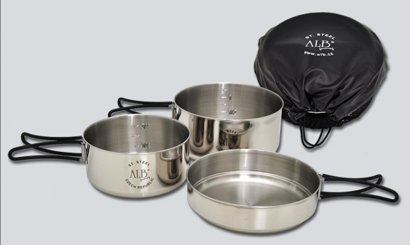 - z vnější strany s povrchem leštěným, z vnitřní jemně broušeným. Nádoby jsou opatřeny lemovkou, která zvyšuje jejich pevnost. Velká nádoba je patřena prolisem, který zvyšuje její stabilitu na vařiči. Nádoby i poklice jsou opatřeny sklopnými držadly, které lze v případě potřeby odejmout. Součástí dodávky je síťový textilní obal.