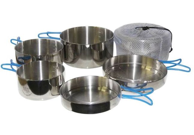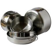 - z vnější strany s povrchem leštěným, z vnitřní jemně broušeným. Nádoby jsou opatřeny lemovkou, která zvyšuje jejich pevnost. Velká a střední miska jsou patřeny prolisem, který zvyšuje stabilitu nádob na vařiči. Nádoby i poklice jsou opatřeny sklopnými držadly, které lze v případě potřeby odejmout. Součástí dodávky je síťový textilní obal.